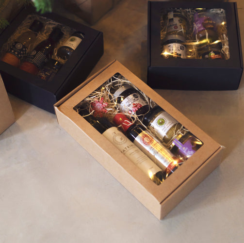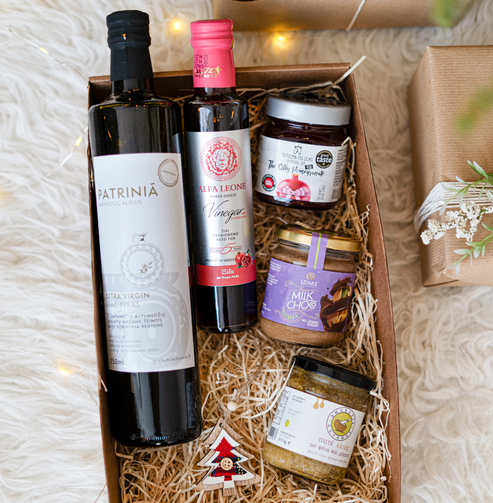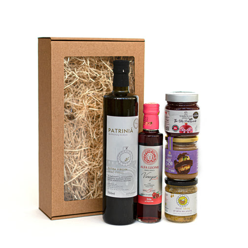 Įvairūs graikiški skoniai vienoje dovanoje: alyvuogių aliejus - sveikatai, actas - salotoms, riešutų kremas - kai norisi saldžiai, granatų džemas - pusryčiams ir alyvuogių užtepėlė prie vyno ir sūrio. Tai universali dovana tinkanti tiek draugų porai, tiek verslo parteriams.