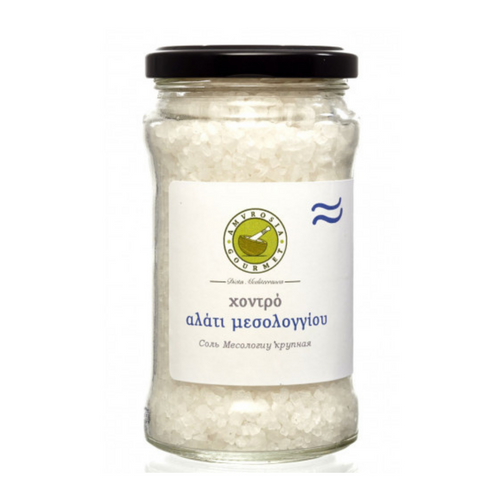 Ši jūros druska yra surinka rankomis, išplauta ir išdžiovinta saulėje Messolonghi regione, Graikijoje. Ji yra visiškai natūrali ir be jokių priedu.